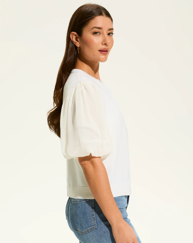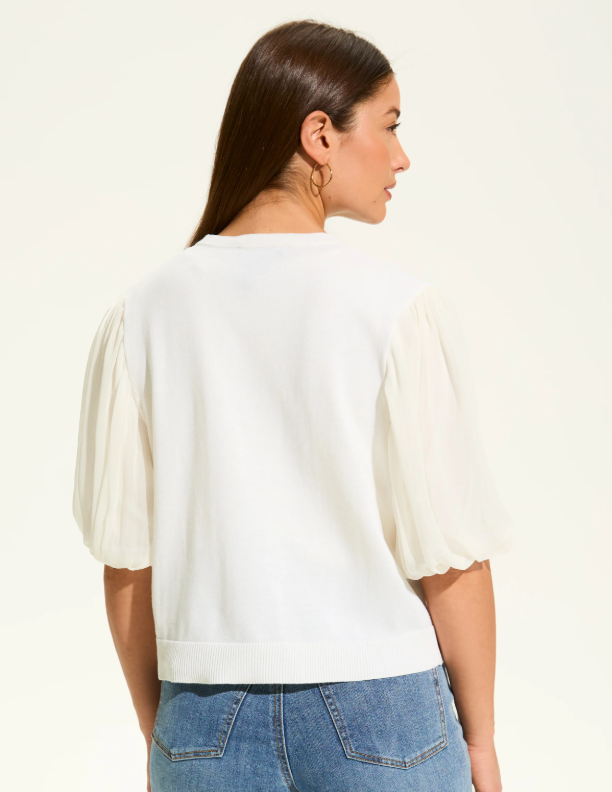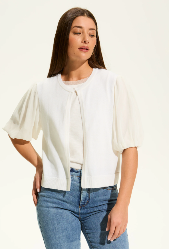 Add a touch of romance to your denim outfit with this lightweight ivory cardigan. With puff sleeves and a trendy design, it's perfect for elevating your everyday style. Made with a cotton blend, it features short sleeves and a round neck for added comfort.