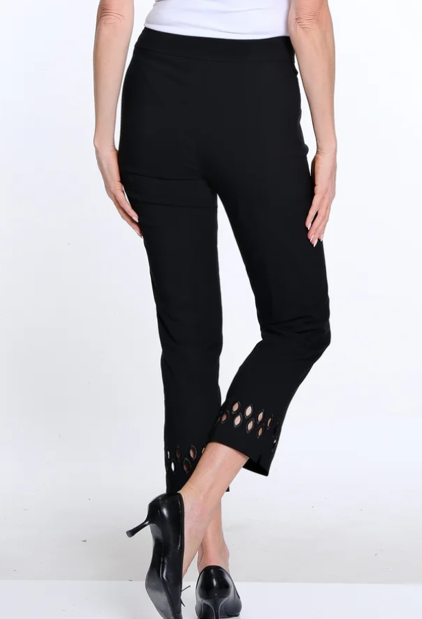 These solid twill and denim ankle pants make a statement with their unique detailing. Real front and back pockets and a geometric shape embroidered cut-out hem add a touch of modern flair to the classic style. Made from a comfortable, stretchy, and flattering rayon-nylon-spandex blend, these pants are perfect for any occasion. Petite sizing. Inseam 24.5".