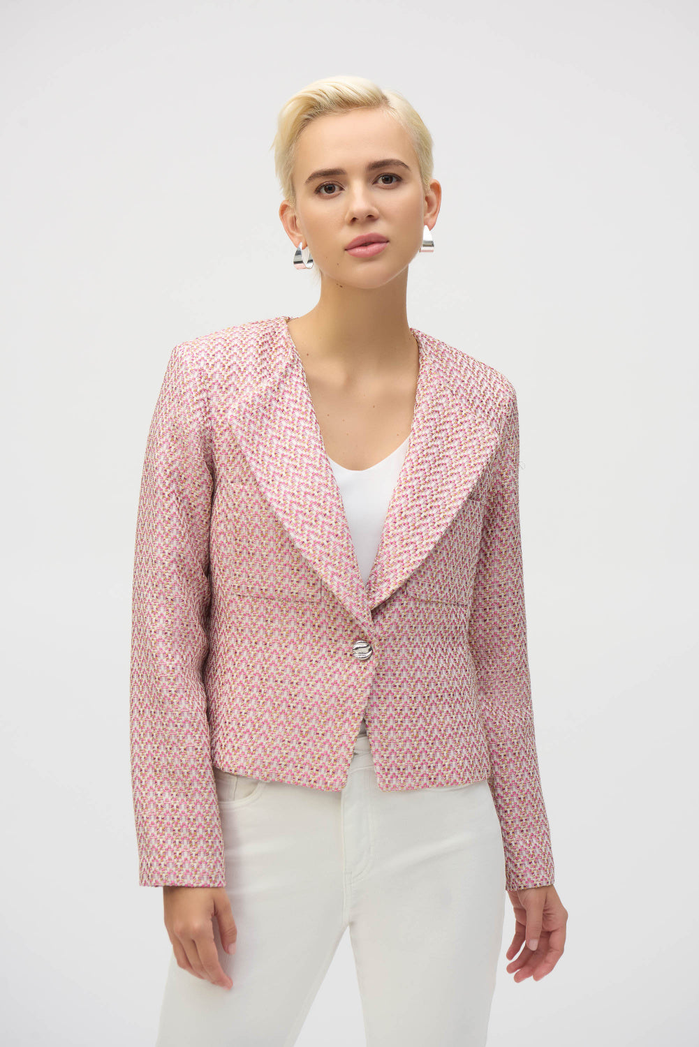 This bouclé blazer redefines polished style. The lapel collar and chest pockets exude undeniable confidence, while the boxy silhouette lends a bold feel to this garment. The shank button closure elevates the piece’s refined look to perfection.