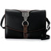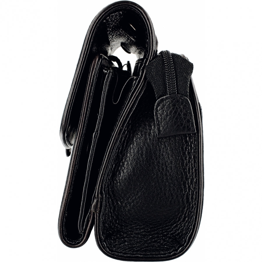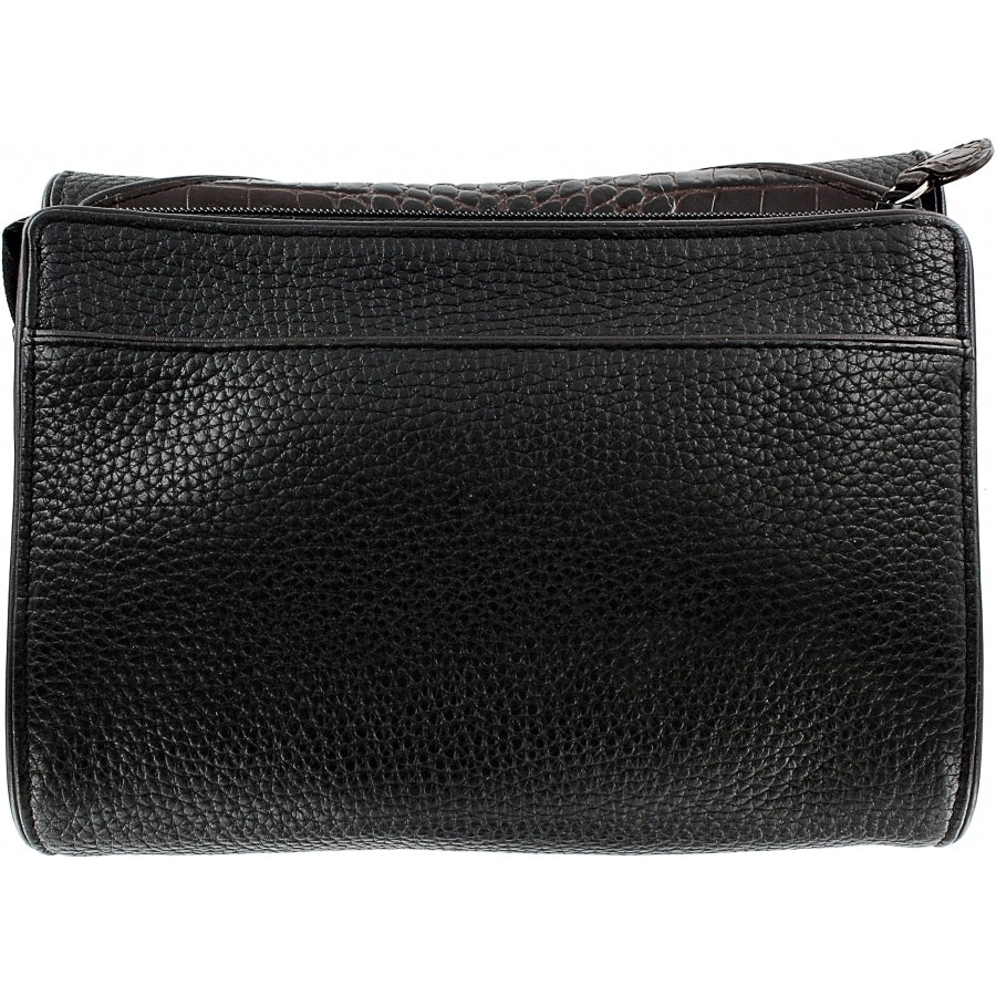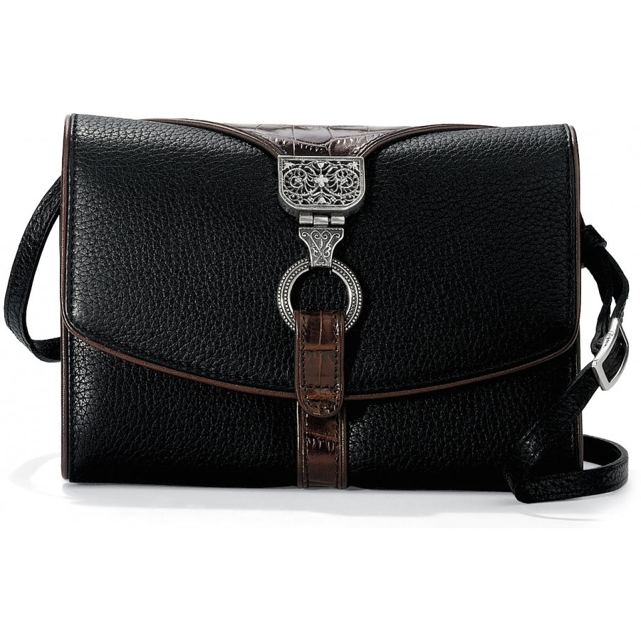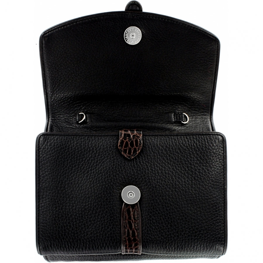 Silverwork this finely done looks like sterling silver. Black top grain leather with brown croco accents. Crossbody strap, 10 credit card slots, checkbook slot.